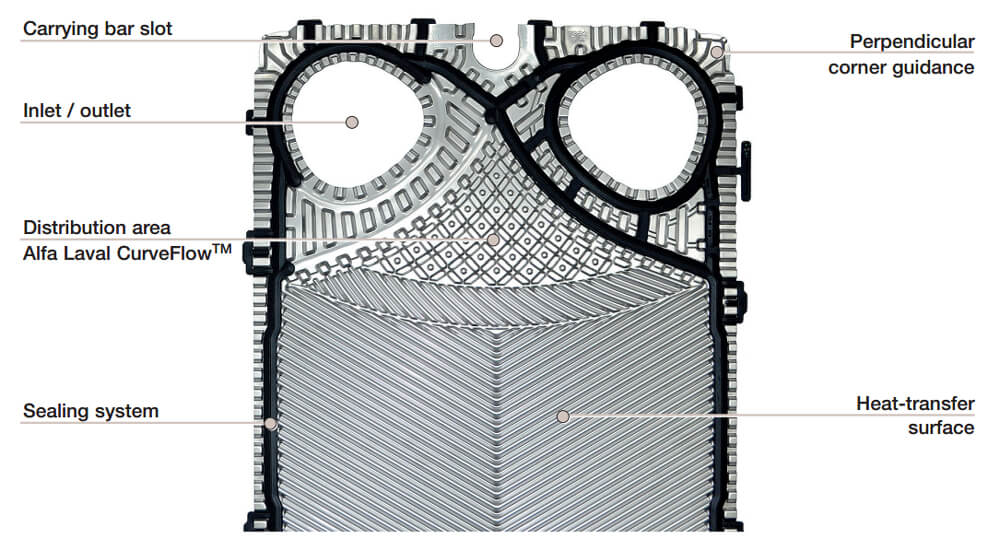 The plate distribution is pressed in a chocolate pattern (an Alfa Laval design feature). This type of corrugation has numerous advantages: