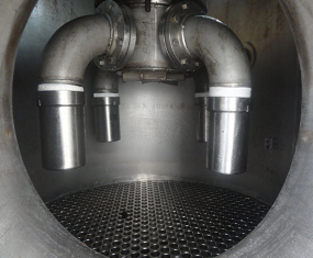 Another type of liquid distributor available in Alfa Laval FilmVap evaporators is the jet distributor, fitted with solid cone spray nozzles. The size and quantity of these nozzles depend on the liquid flow and the tube sheet diameter in the heat exchanger. The larger hole size compared with a platter distributor reduces the risk of blocking the nozzle and ensures even distribution to the tubes.
